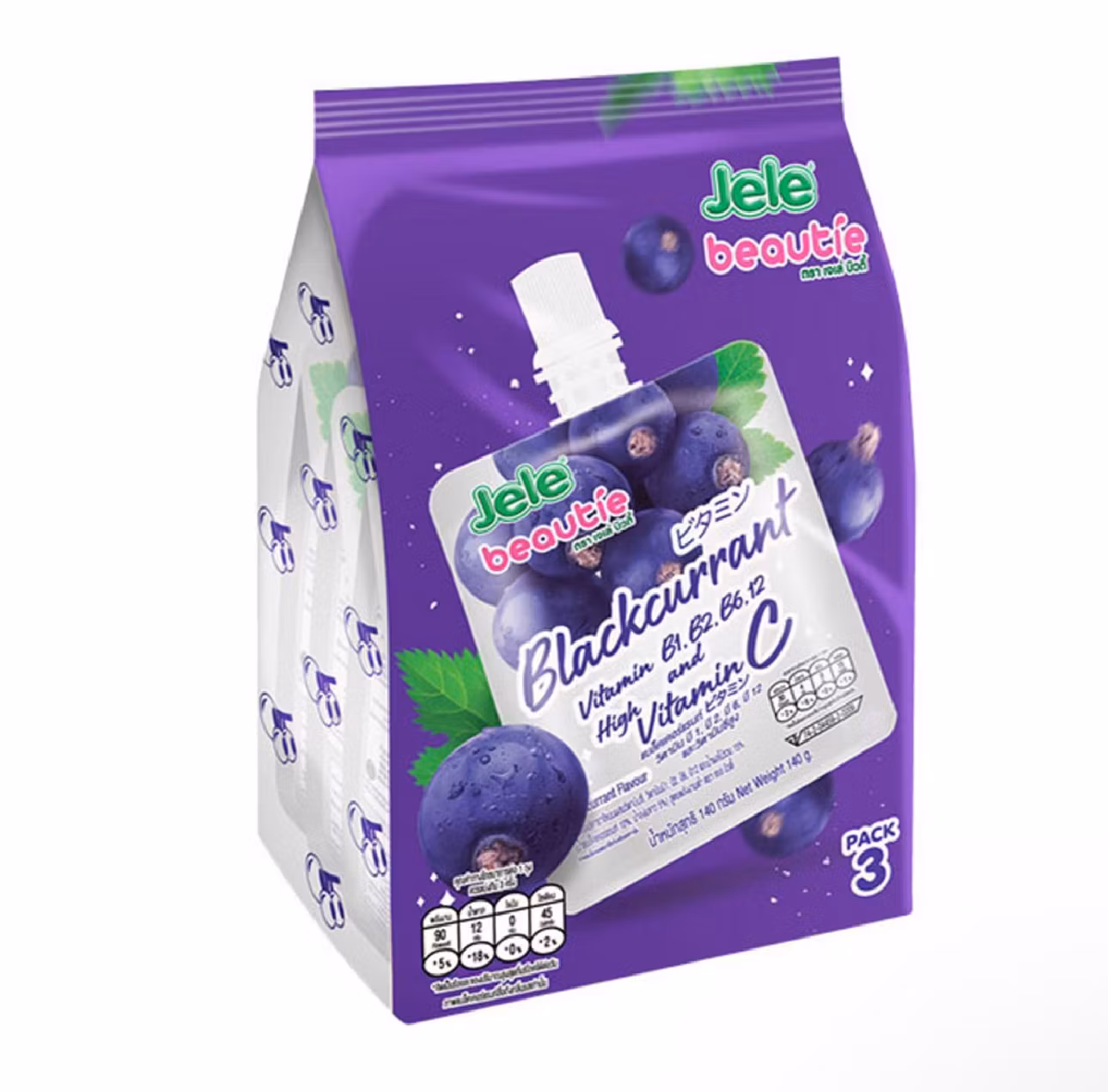 Vatten, svartvinbärsjuice, vit druvjuice, fruktossirap, socker, kaliumcitrat (E332), äppelsyra (E296), citronsyra (E330), karragenan (E407), johannesbrödmjöl (E410), svarta vinbär”, vitamin C (22,1mg/100g), natriumbensoat (E211), sukralos (E955), acesulfamkalium (E950), vitamin B6 (0,39mg/100g), vitamin B2 (0,4mg/100g), vitamin B1 (0,16mg/ 100g), vitamin B12 (0,36mg/100g).