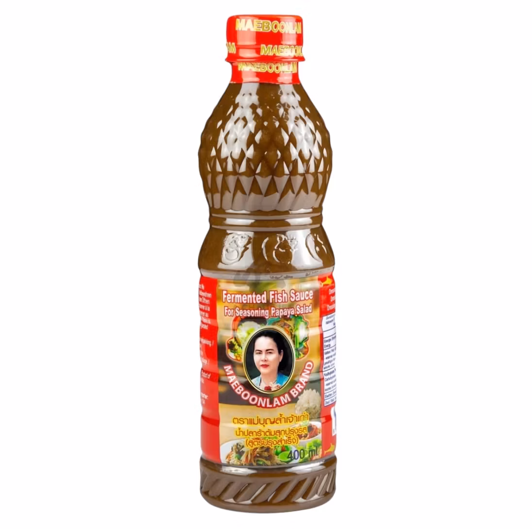 Ingredienser: Fermenterad fisksås ( fisk, malet rostat ris, vatten, salt) 93%, socker 5%, inlagd vitlöksjuice ( vatten, vitlök, salt, surhetsreglerande medel: E260), smakförstärkare : E621, färg: E150c, stabiliseringsmedel: E415.