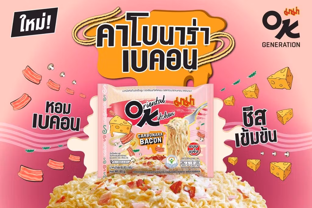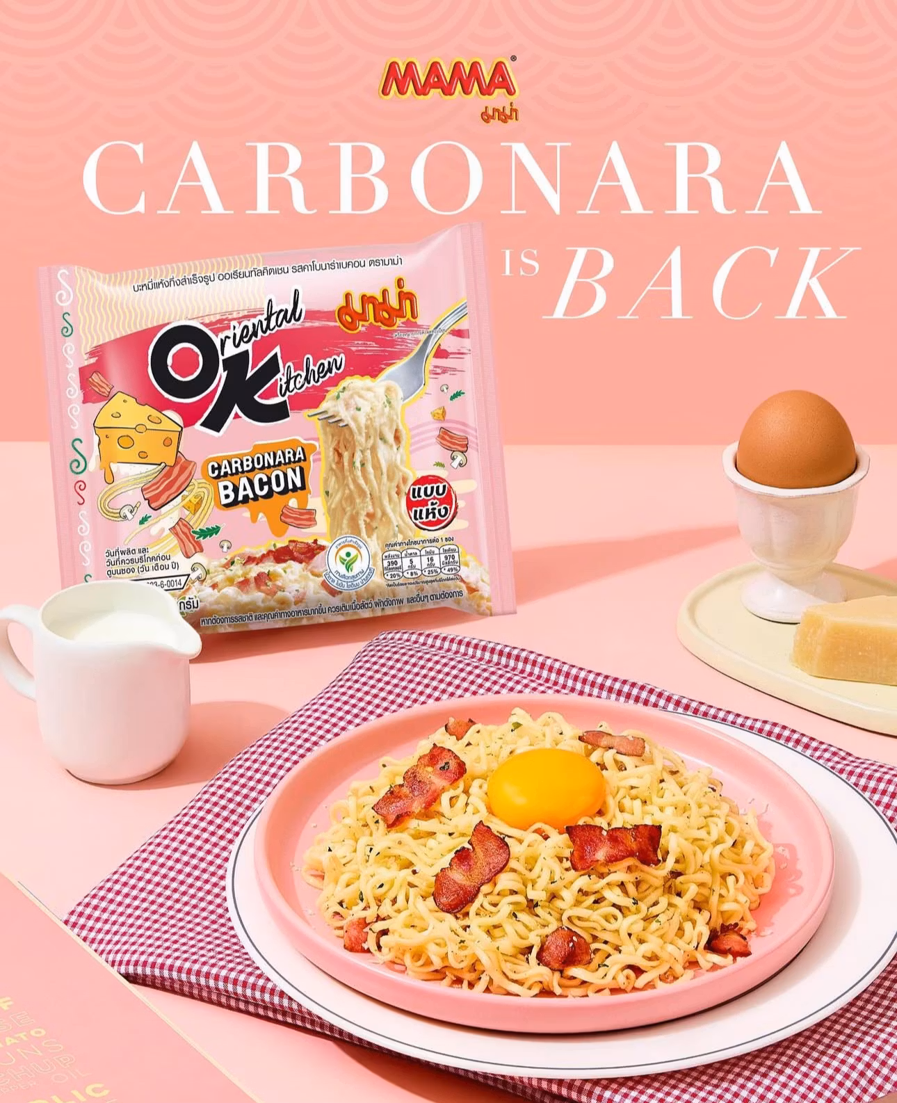 Snabbnudlar. Ingredienser: VETEmjöl, modifierad tapiokastärkelse, palmolja, kräm (glukossirap, fullhärdad palmolja, natriumkaseinat (MJÖLK), klumpförebyggande medel (E551), maltodextrin, modifierad majsstärkelse), riskliolja, socker, salt, texturerat SOJAprotein, arom (MJÖLK), smakförstärkare (E621, E635), kryddor, surhetsreglerande medel (E451, E500, E501), helt ÄGGpulver, SOJApulver (SOJA, VETE), jästextraktpulver, fötjockningsmedel (E466), klumpförebyggande medel (E551), persiljeflingor, syra (E330). Innehåller: VETE, MJÖLK, ÄGG, SOJA.
