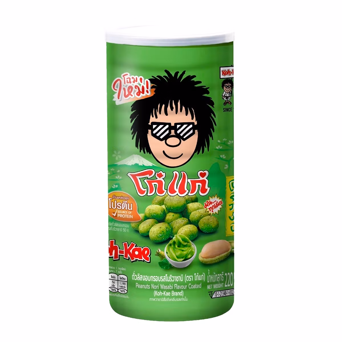 Ingredienser: JORDNÖTTER, VETEMJÖL, klibbigt rismjöl, majsmjöl, wasabiarom, socker, salt, nori, sötningsmedel E950, färgämne (E102, E133), bakpulver E500.