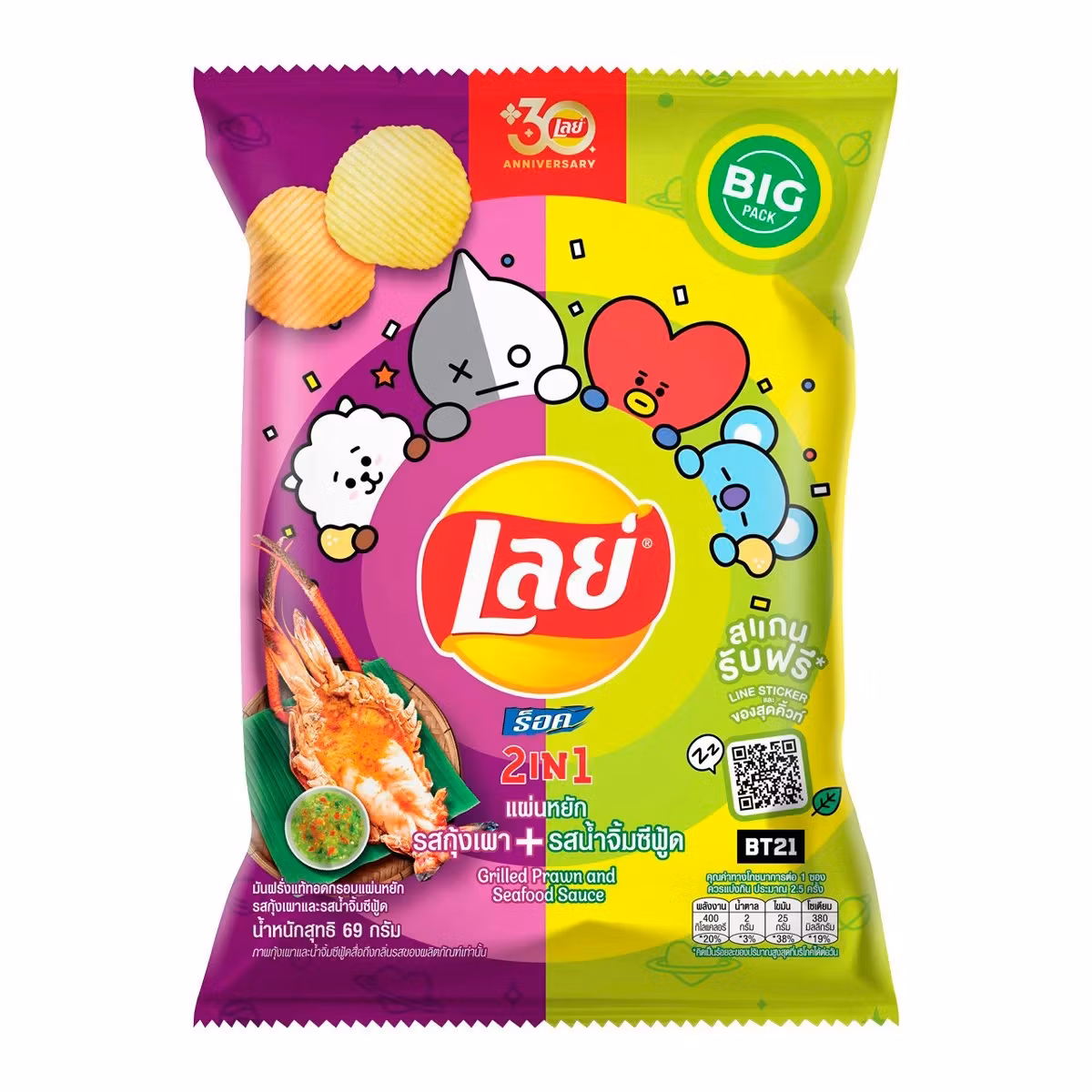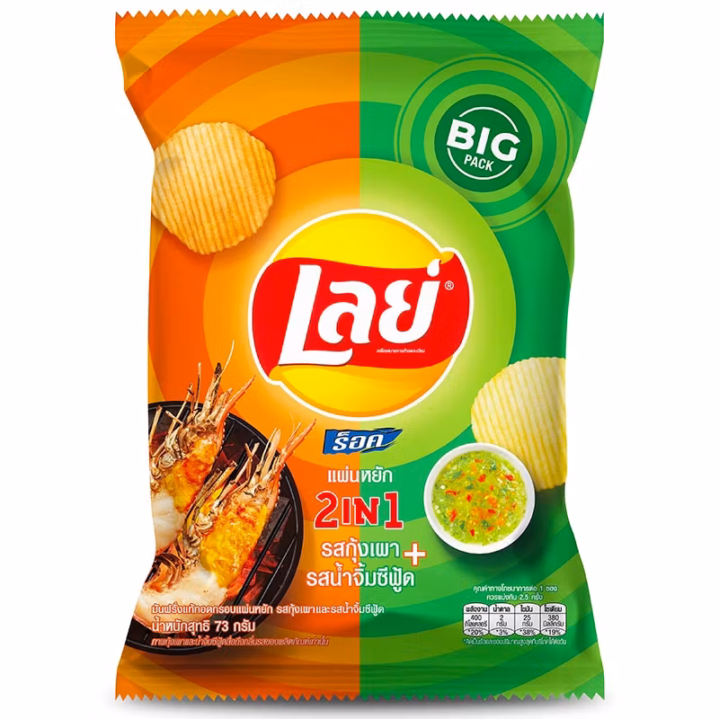 Ingredienser: Potatis 58.45%, riskliolja (ohärdad), smakförstärkare (E621, E635), färgämne (E141), klumpförebyggande medel (E551), surhetsreglerande medel (E330), förpackningsfas (E941), arom.